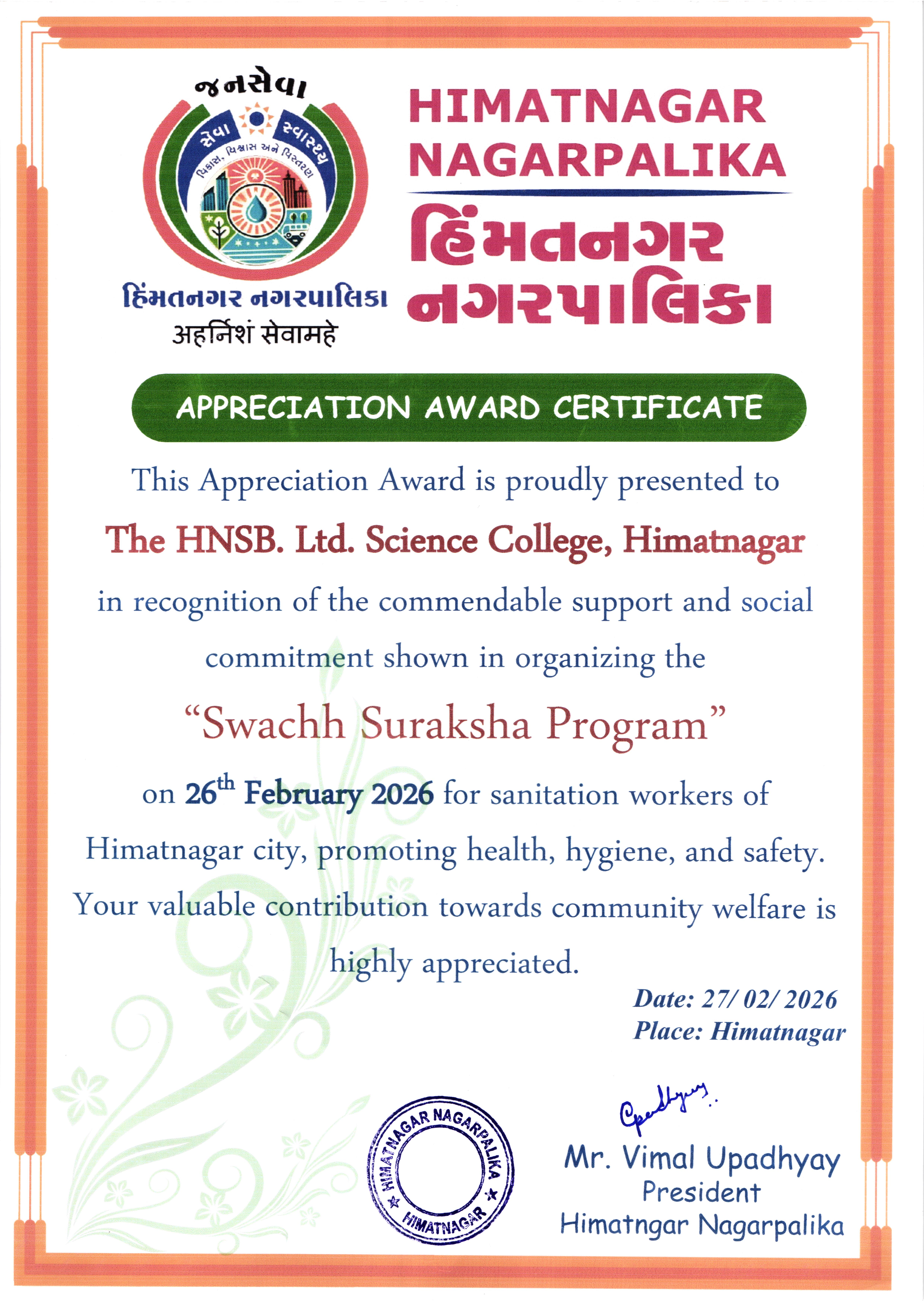 | 7 | Appreciation Award from Himatnagar Nagarpalika | View/Download |